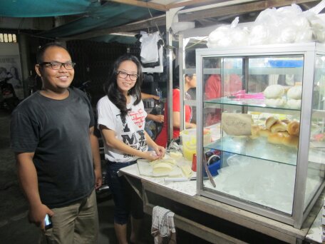 Sambil makan, saya berkabar ria dengan teman SMA yang tinggal di Singkawang, Prima. Sesaat kemudian dia datang bersama suaminya, Adri, yang tak lain adik kelasnya bojoku. Ngobrol sebentar…lalu berpisah. Mereka membawakan kami oleh-oleh keripik keladi, manisan lidah buaya, juga kue khas peranakan macam pia dengan isi kumbu. Selanjutnya, kami meneruskan agenda untuk pulang, disempatkan mampir klenteng untuk foto, rehat, dan jajan makanan kecil untuk di bawa pulang ke Pontianak.
